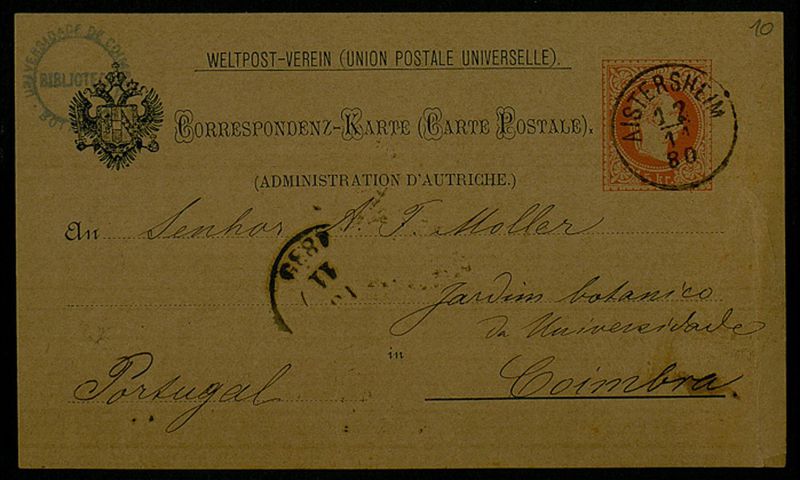 Correspondenz-Karte, 1880 Nov. 12, Aistersheim, an Senhor A. F. Moller, Coimbra