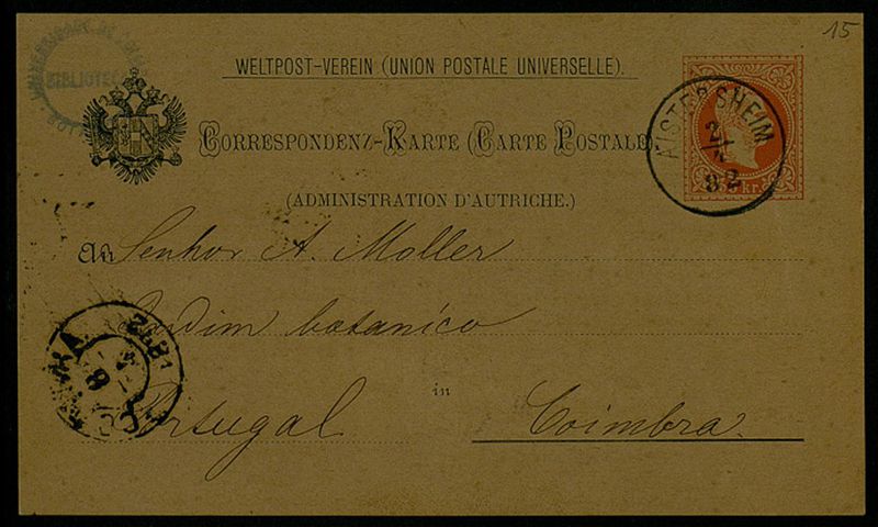 Correspondenz-Karte, 1882 Apr. 3, Aistersheim, an Senhor A. Moller, Coimbra
