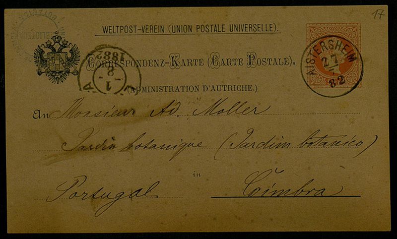 Correspondenz-Karte, 1882 Juli 27, Aistersheim, an Monsieur Ad. Moller, Coimbra
