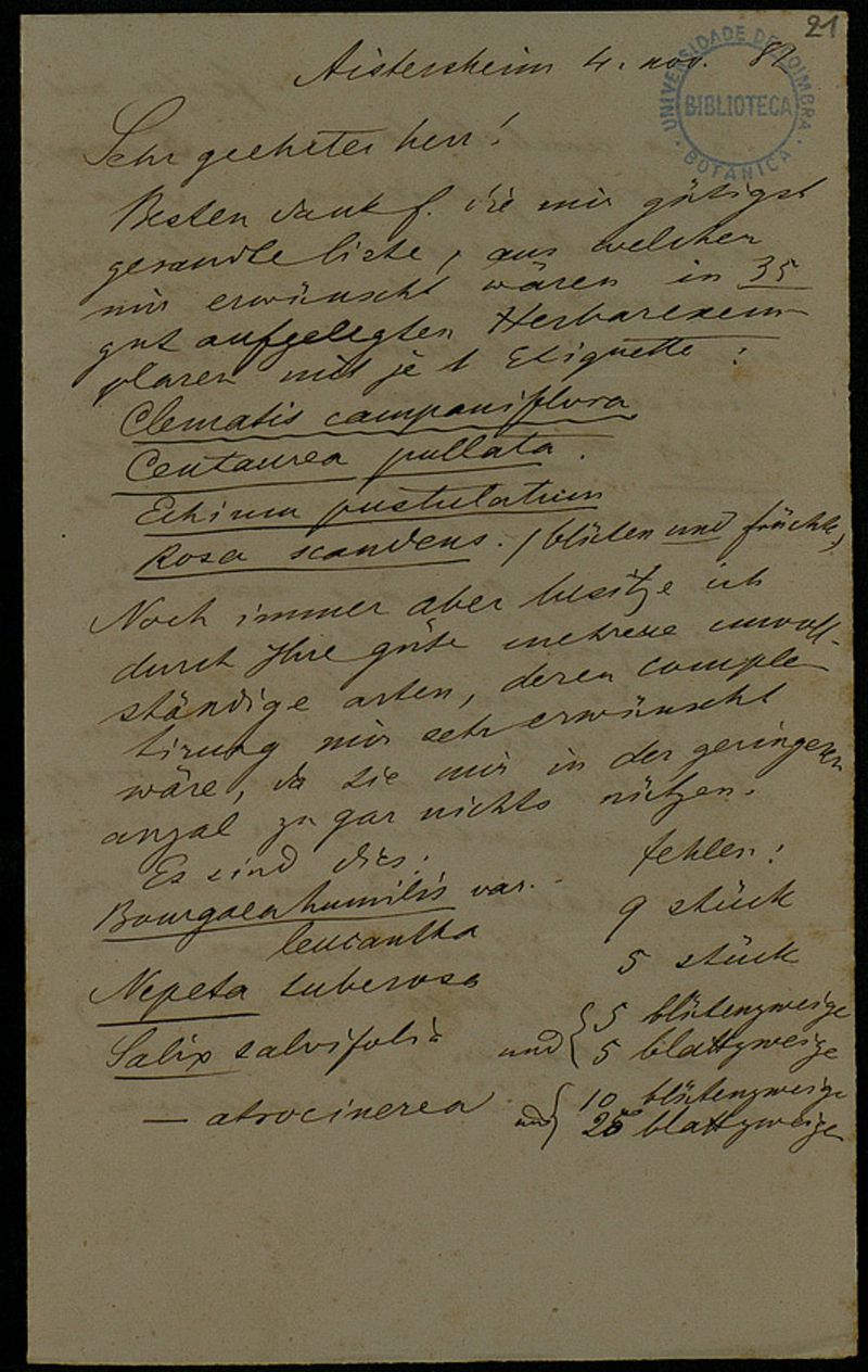 [Brief], 1882 Nov. 4, Aistersheim, [an] Herr[n Adolfo F. Möller, Coimbra]