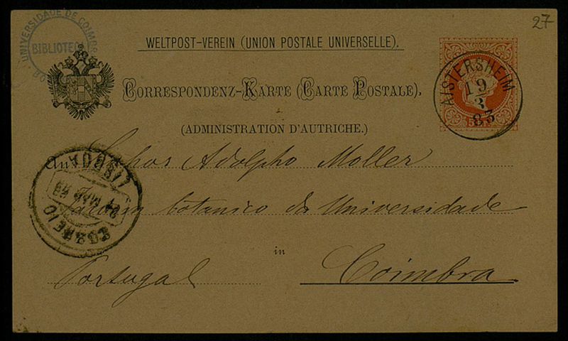 Correspondenz-Karte, 1883 März 19, Aistersheim, an Senhor Adolpho Moller, Coimbra