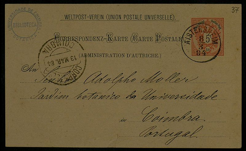 Correspondenz-Karte, 1884 März 8, Aistersheim, an Senhor Adolpho Moller, Coimbra