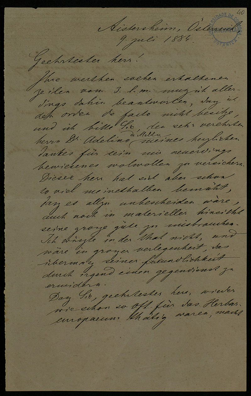 [Brief], 1884 Juli 9, Aistersheim, [an] Herr[n Adolfo F. Möller, Coimbra]