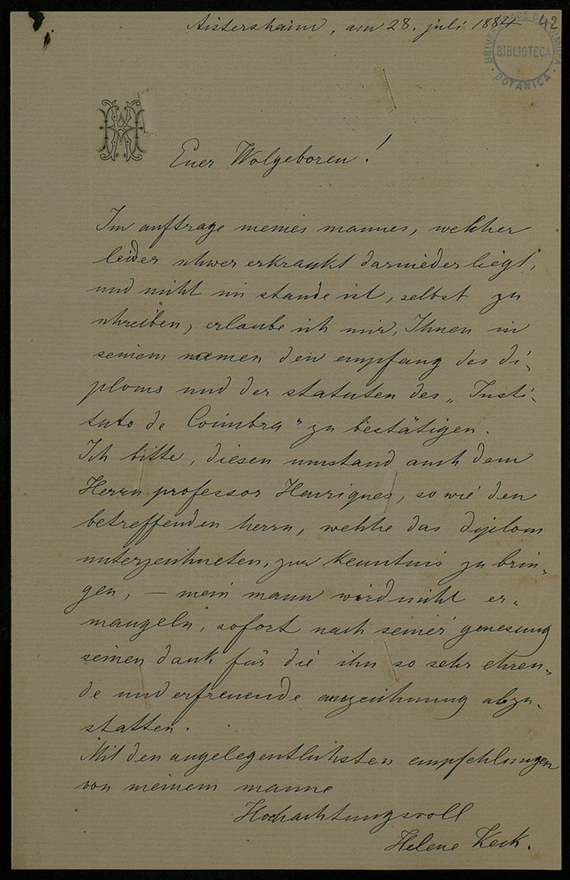 [Brief], 1884 Juli 28, Aistersheim, [an] Herr[n Adolfo F. Möller, Coimbra]