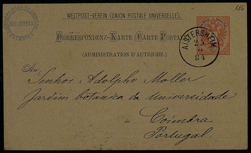 Correspondenz-Karte, 1884 Sept. 26, Aistersheim, an Senhor Adolpho Moller, Coimbra