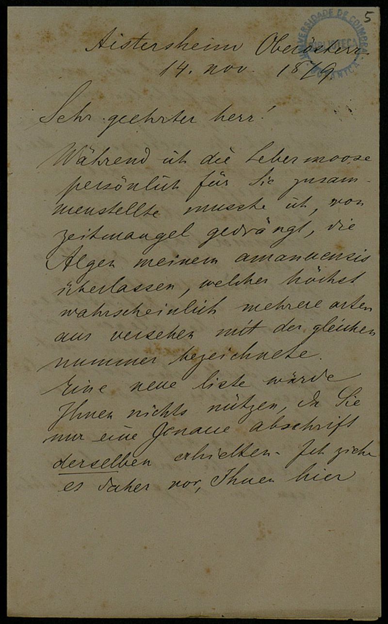 [Brief], 1879 Nov. 14, Aistersheim, [an] Herr[n Adolfo F. Möller, Coimbra]