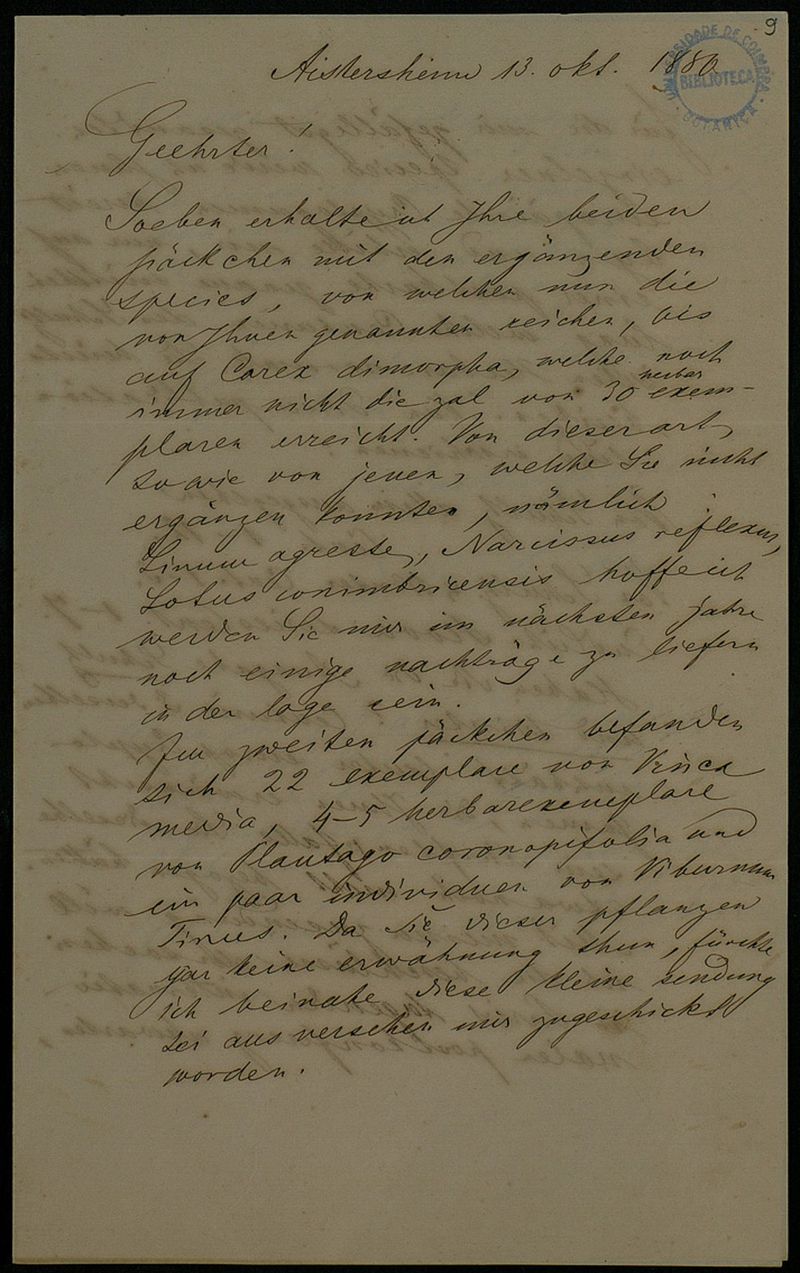 [Brief], 1880 Okt. 13, Aistersheim, [an Herrn Adolfo F. Möller, Coimbra]