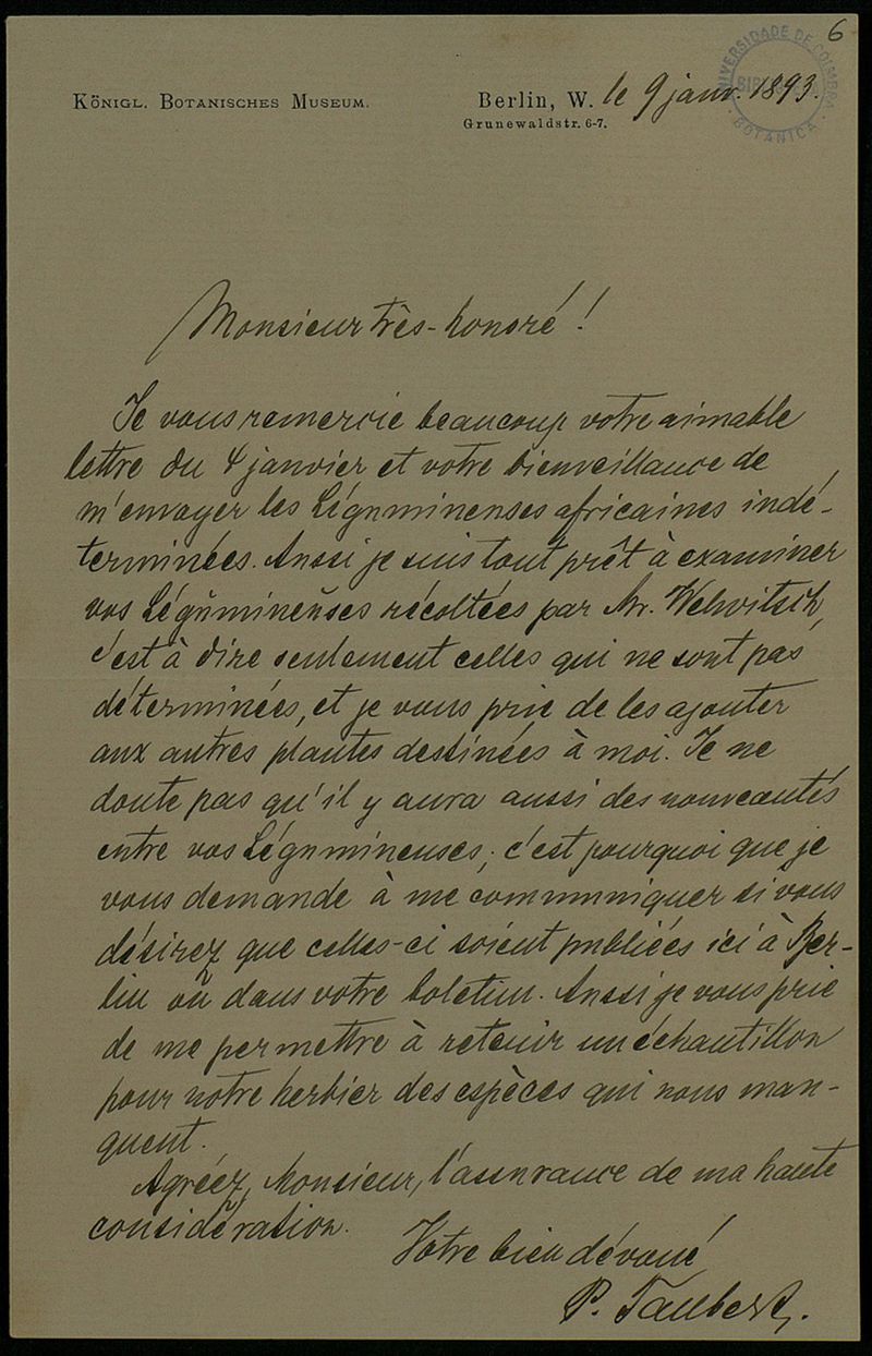 [Lettre], 1893 jan. 9, Berlin, [à] Monsieur [Adolfo F. Moller, Coimbra]