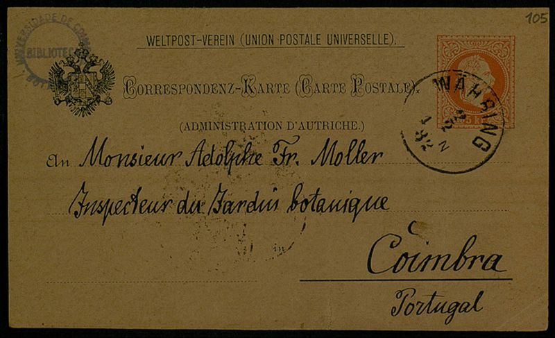 Correspondenz-Karte, 1882 Fev. 2, Wien, an Monsieur Adolphe Fr. Moller, Coimbra