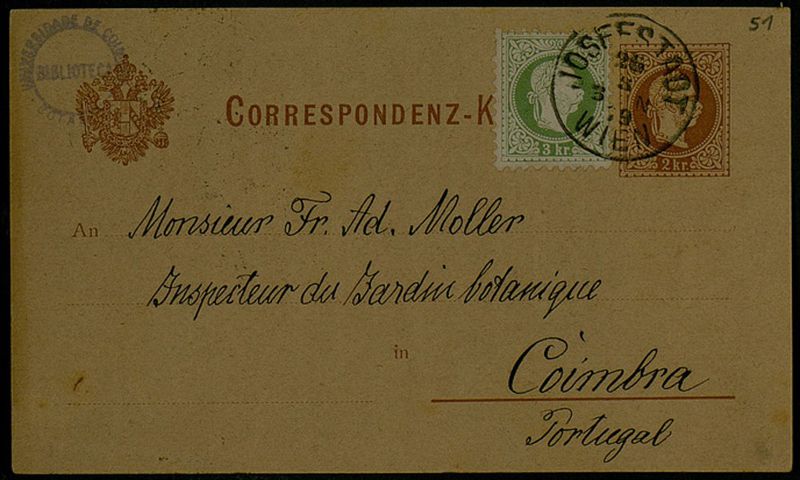 Correspondenz-K[arte], 1879 Aug. 26, Wien, an Monsieur Fr. Ad. Moller, Coimbra