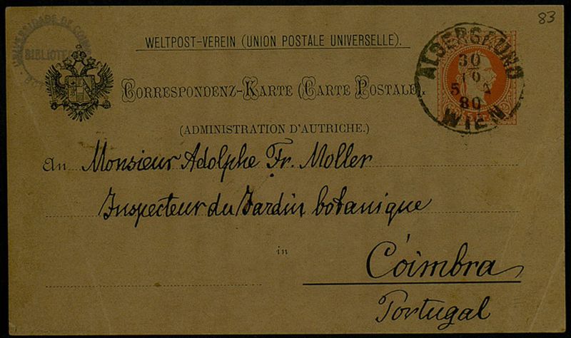 Correspondenz-Karte, 1880 Okt. 29, Wien, an Monsieur Adolphe Fr. Moller, Coimbra