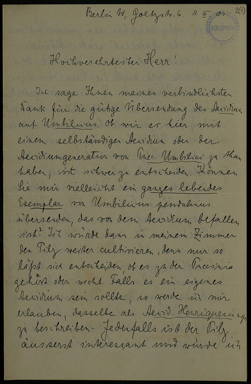 [Brief], 1901 März 11, Berlin, [an] Herr[n Júlio Henriques], Coimbra]