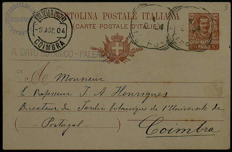 Cartolina Postale Italiana, 1904 août 4, Palermo, à Monsieur le Professeur J. A. Henriques, Coimbra