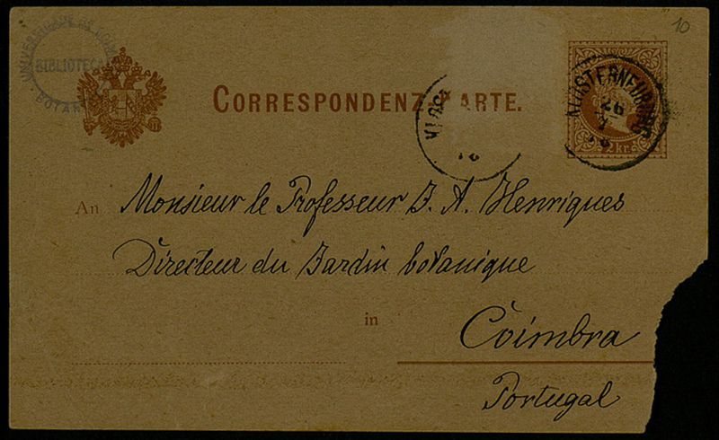 Correspondenz-Karte, 1878 juil. 26, [Klosterneuburg], an Monsieur le Professeur J. A. Henriques, Coimbra