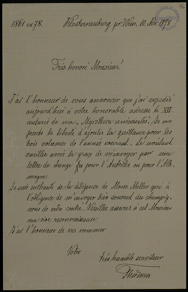 [Lettre], 1878 nov. 10, Klosterneuburg, [à] Monsieur [Júlio Henriques, Coimbra]