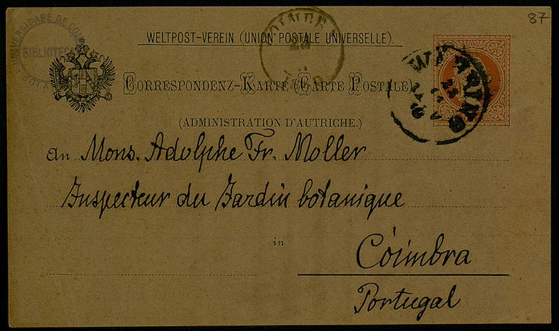 Correspondenz-Karte, 1880 Nov. 21, Wien, an Monsieur Adolphe Fr. Moller, Coimbra