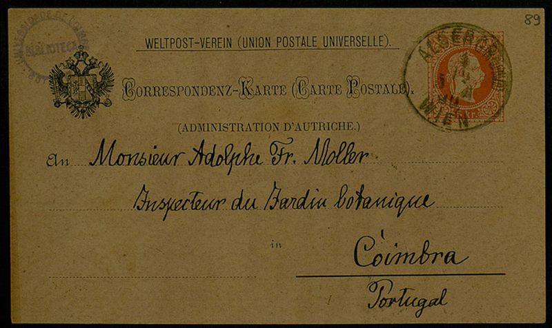 Correspondenz-Karte, 1880 Dez. 3, Wien, an Monsieur Adolphe Fr. Moller, Coimbra