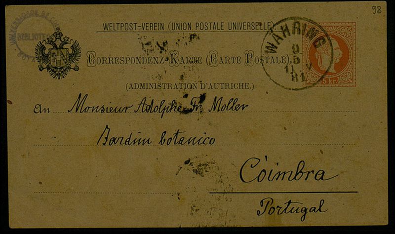 Correspondenz-Karte, 1881 Mai 9, Wien, an Monsieur Adolphe Fr. Moller, Coimbra