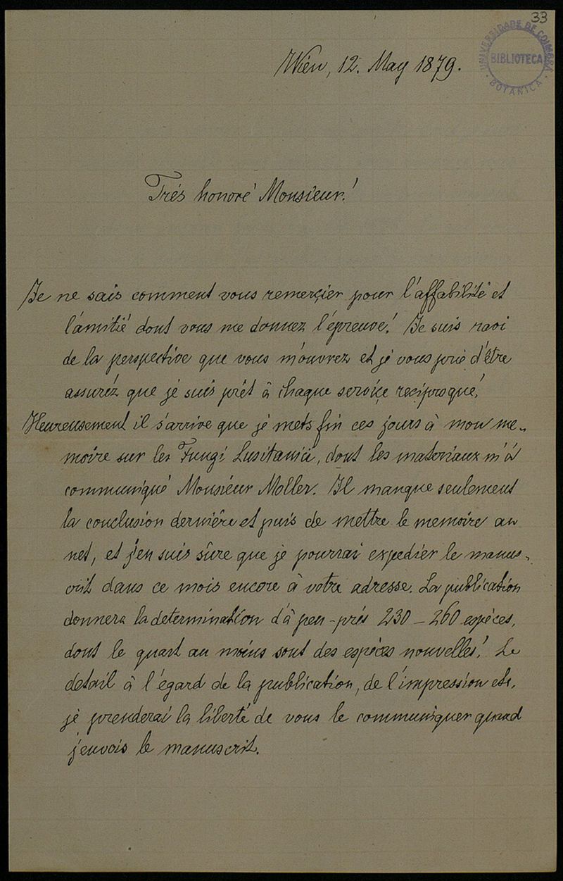 [Lettre], 1879 mai 12, Wien, [à] Monsieur [Júlio Henriques, Coimbra]