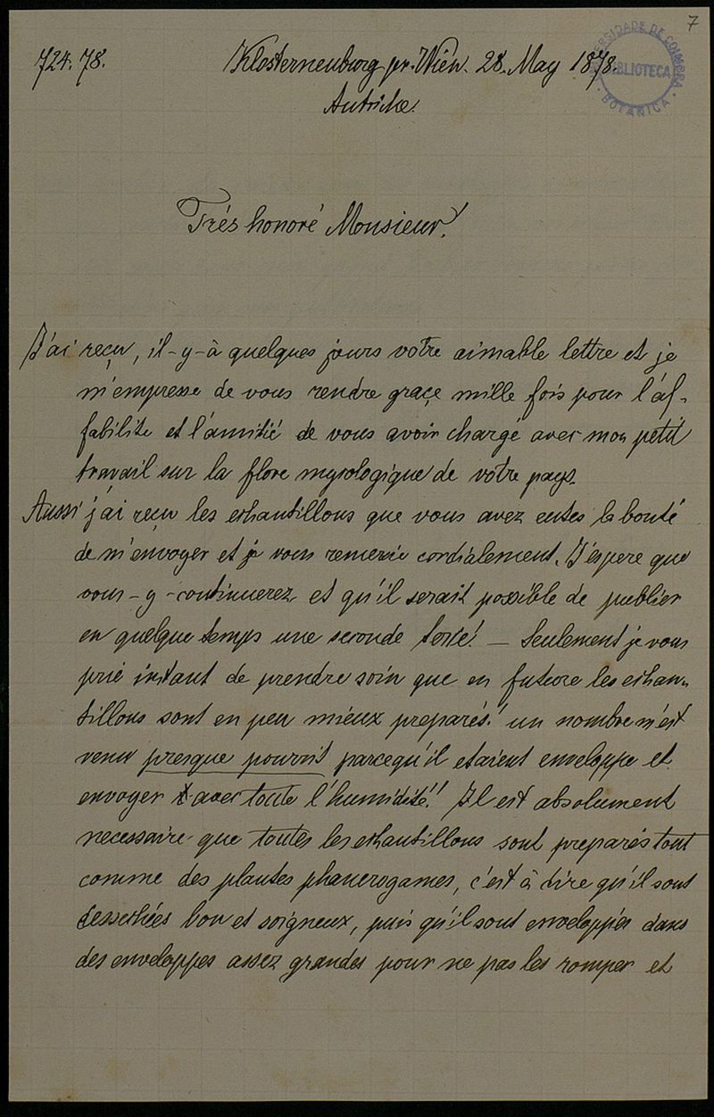 [Lettre], 1878 mai 28, Klosterneuburg, [à] Monsieur [Júlio Henriques, Coimbra]