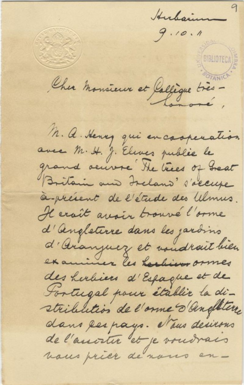 [Lettre], 1911 oct. 09, Herbarium, [Kew], [à Júlio Henriques, Coimbra]