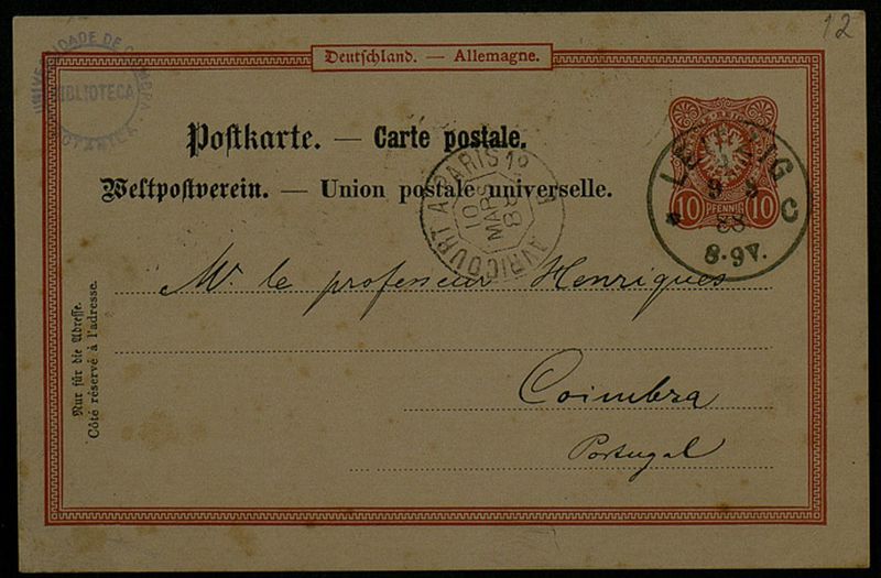 Postkarte, 1888 mars 9, Leipzig, à M. le professeur [Júlio] Henriques, Coimbra