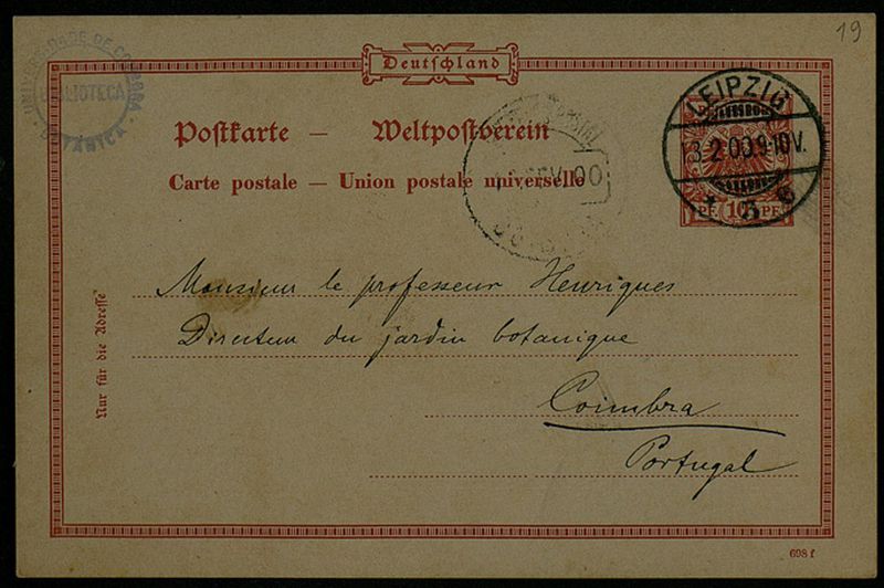 Postkarte, 1900 fév 13, Leipzig, à Monsieur le professeur [Júlio] Henriques, Coimbra