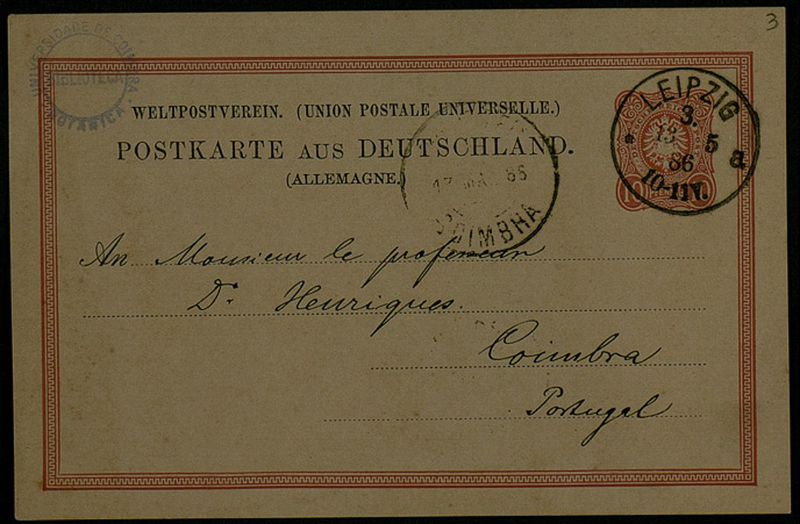 Postkarte aus Deutschland, 1886 mai 12, Leipzig, an Monsieur le professeur Dr. [Júlio] Henriques, Coimbra