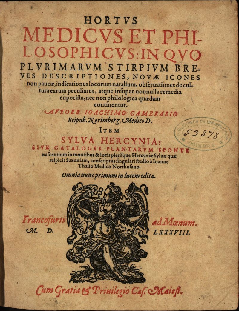 Contém Pt. II: Sylva Hercynia sive Catalogus plantarum sponte nascentium in montibus, et locis vicinis Hercyniae, quae respicit Saxoniam, conscriptus singulari studio / A Joanne Thalio. - Nunc primum in lucem edita. - 133 p. - Pt. III: Icones accurate nunc primum delineat ae praecipuarum stirpium, quarum descriptiones in Horto quam in Sylva Hercynia suis locis habentur / Autore Joachimo Camerario. - XLVII; IX folhas de estampas, [4] p.