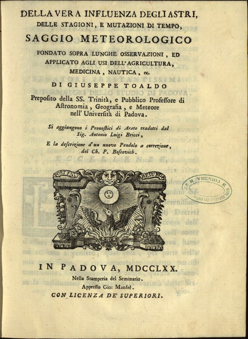 Della vera influenza degli astri, delle stagioni, e mutazioni di tempo, saggio meteorologico fondato sopra lunghe osservazioni, ed applicato agli usi dell' agricultura, medicina, nautica, ec. Di Giuseppe Toaldo ... si aggiungono i Pronostici di Arato tradotti dal Sig. Antonio Luigi Bricci, e la descrizione d'un nuovo Pendolo a correzione, del Ch. P. Boscovich