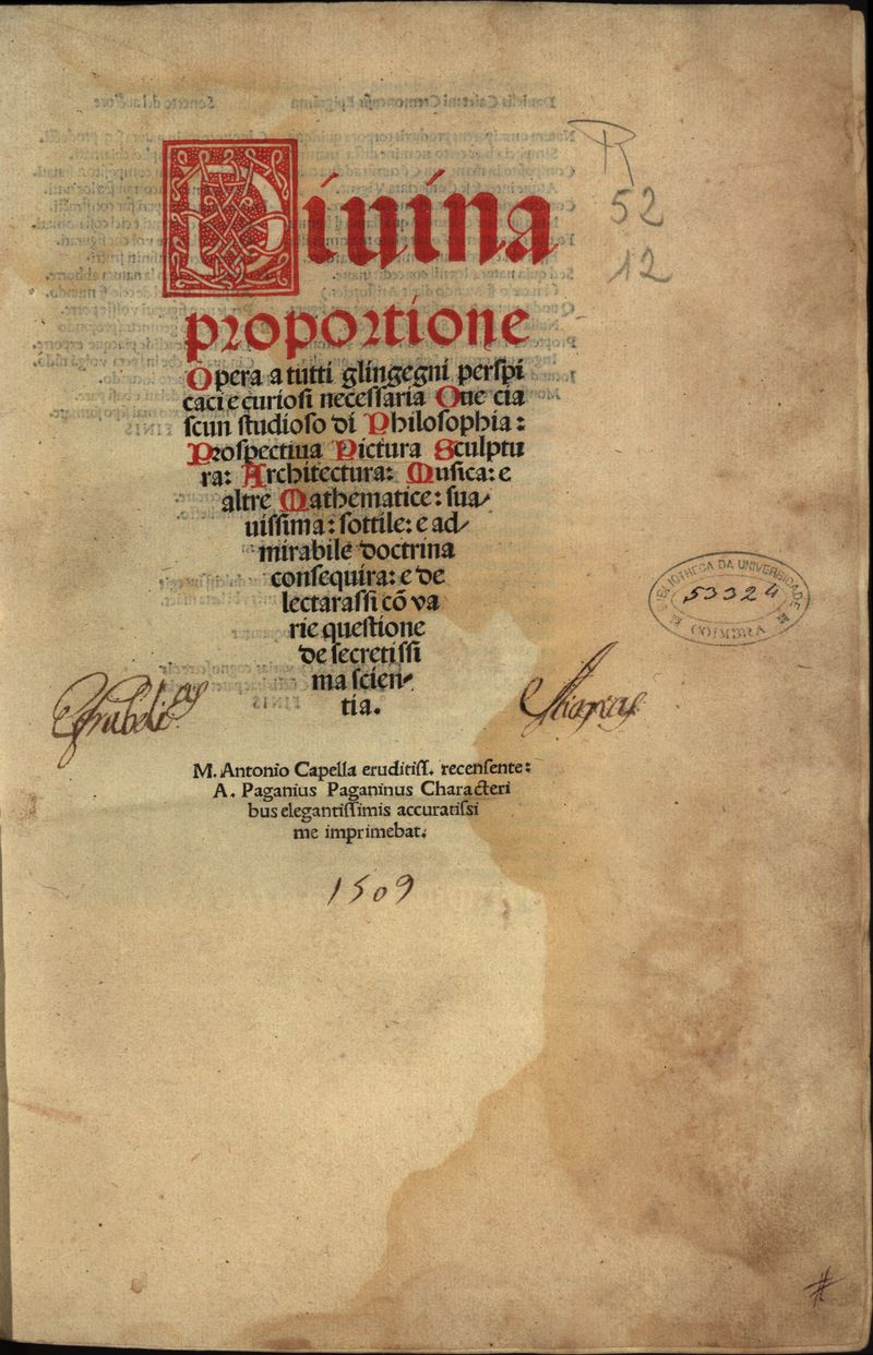 Divina proportione opera a tutti glíngegni perspicaci e curiosi necessaria oue ciascun studioso di philosophia, prospectiua pictura sculptura, architectura, musica, e altre mathematice, suavissima, sottile, e admirabile doctrina consequira, e delectarassi co[n] varie questione de secretissima scientia