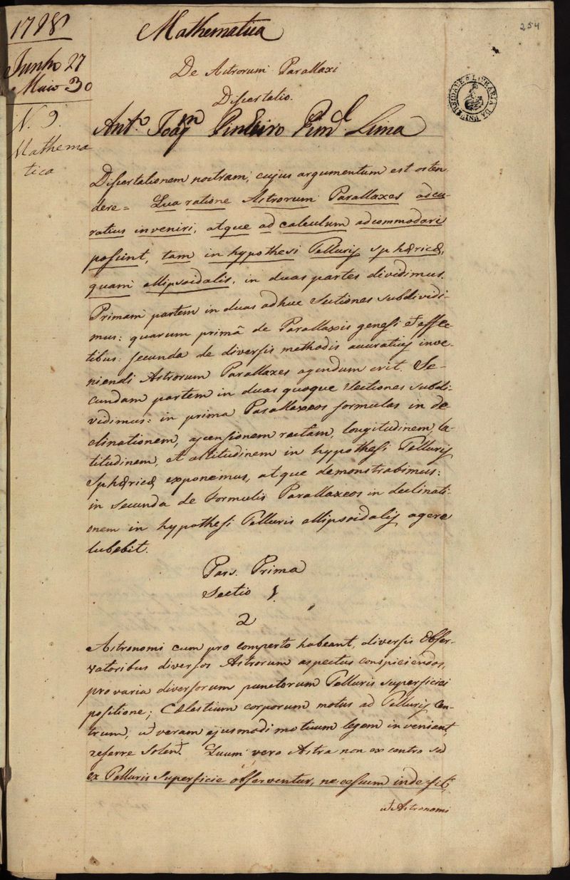 No canto superior esquerdo: 1798, Junho 27, Maio 30, N. 9 Mathematica.