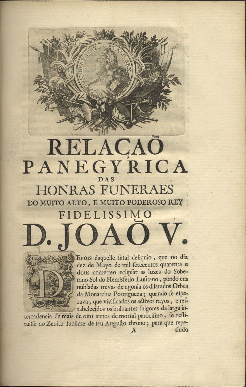 Barros, João Borges de. Relação panegyrica das honras funeraes, que às memorias do ... Rey fidelíssimo D. João V. consagrou a cidade da Bahia Corte da America Portuguesa ... / Pelo Doutor João Borges de Barros, ... com huma collecção de cinco orações funebres, e varias poesias, latinas, e vulgares. Lisboa : na Regia Officina Sylviana e da Academia Real, 1753. p. 1