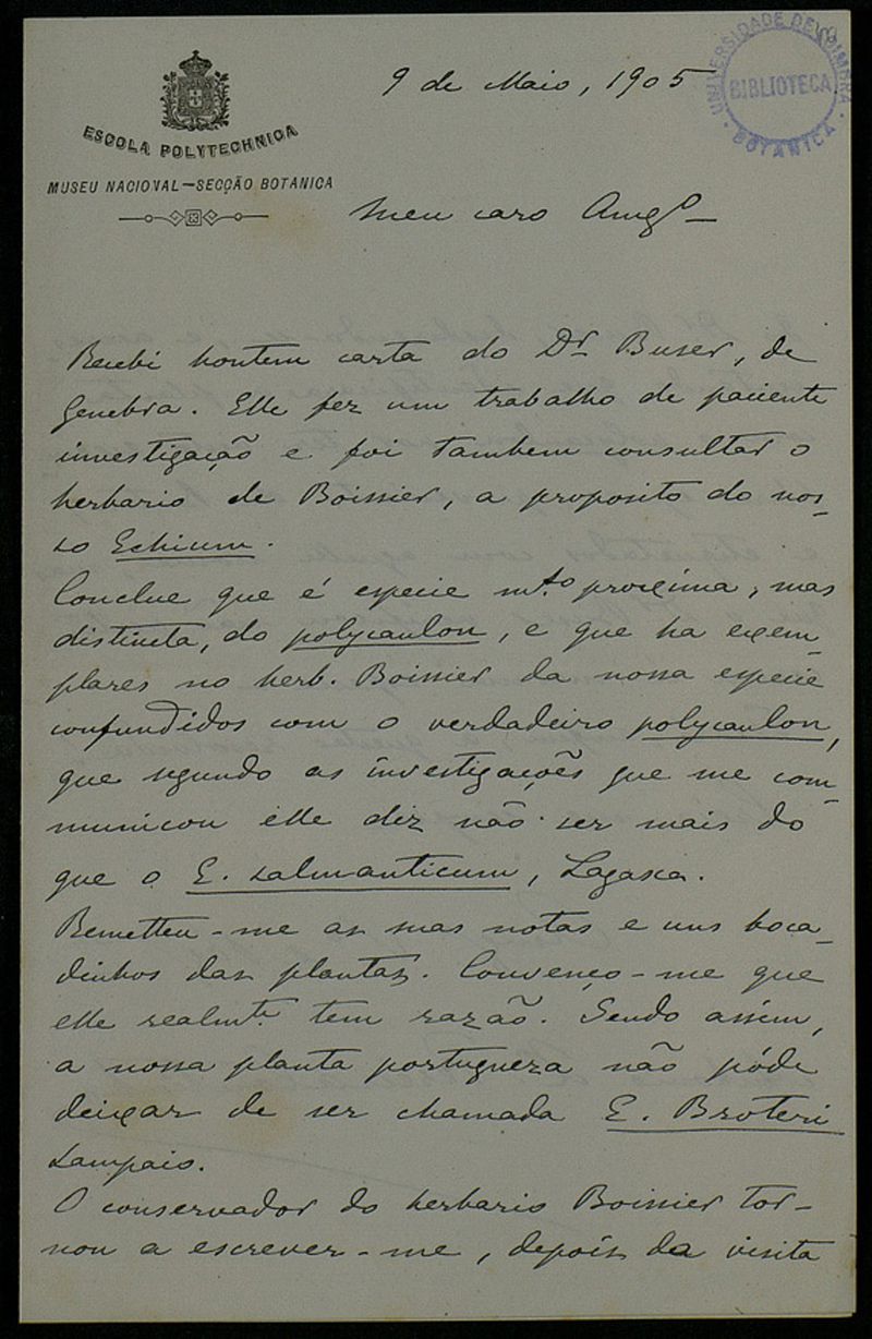 Papel timbrado de: Escola Polytechnica, Museu Nacional - Secção Botanica.