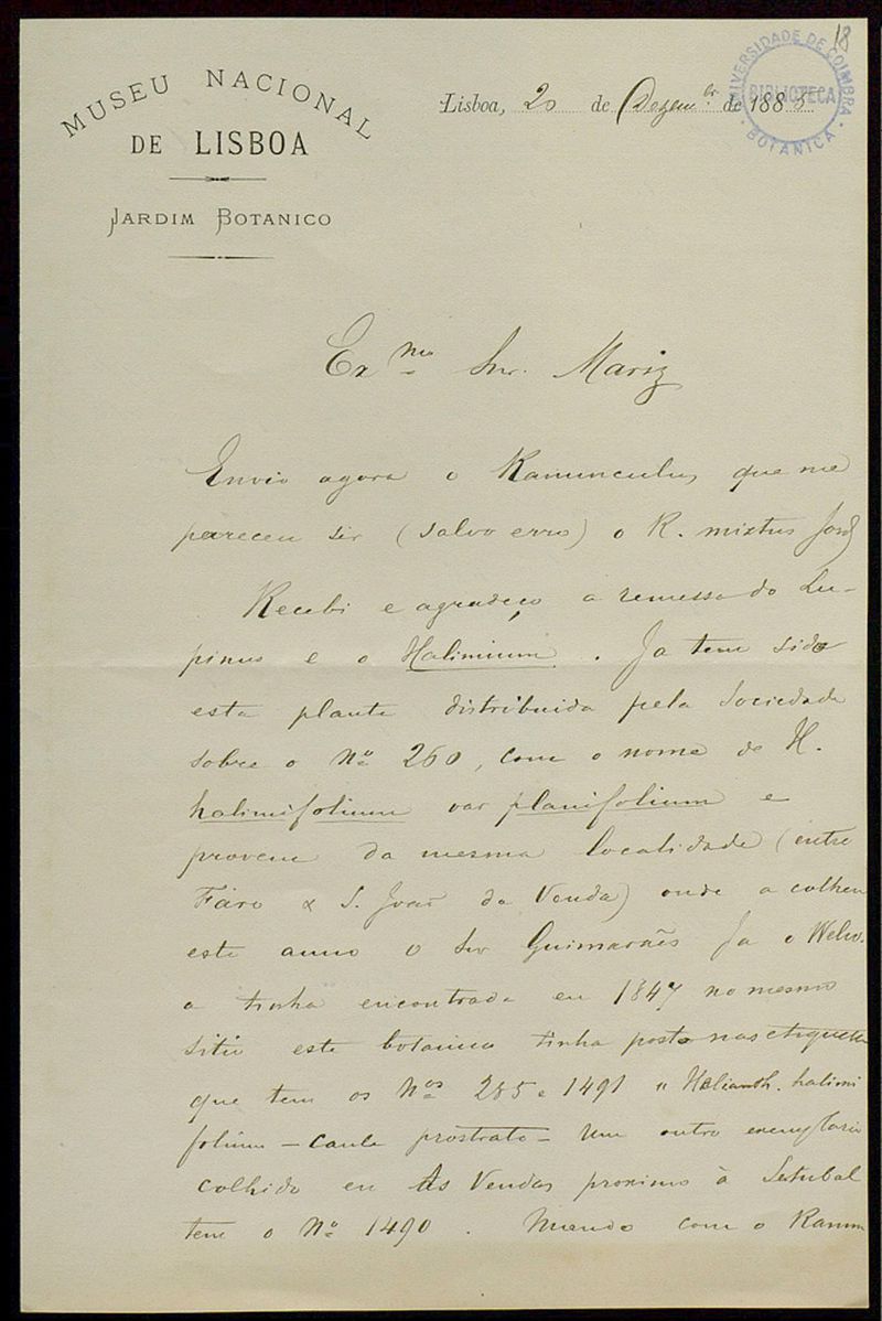 Papel timbrado de: Museu Nacional de Lisboa Jardim Botânico.
