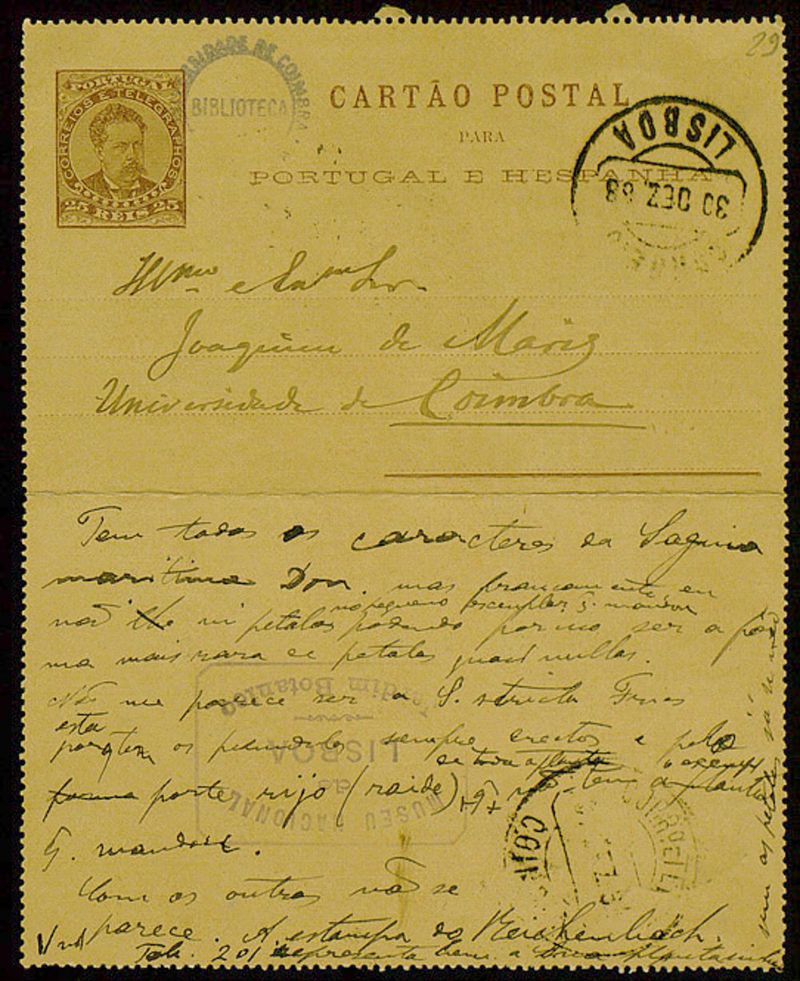 Cartão Postal, 1888 Dec. 29, Lisboa, [a] Joaquim de Mariz, Coimbra