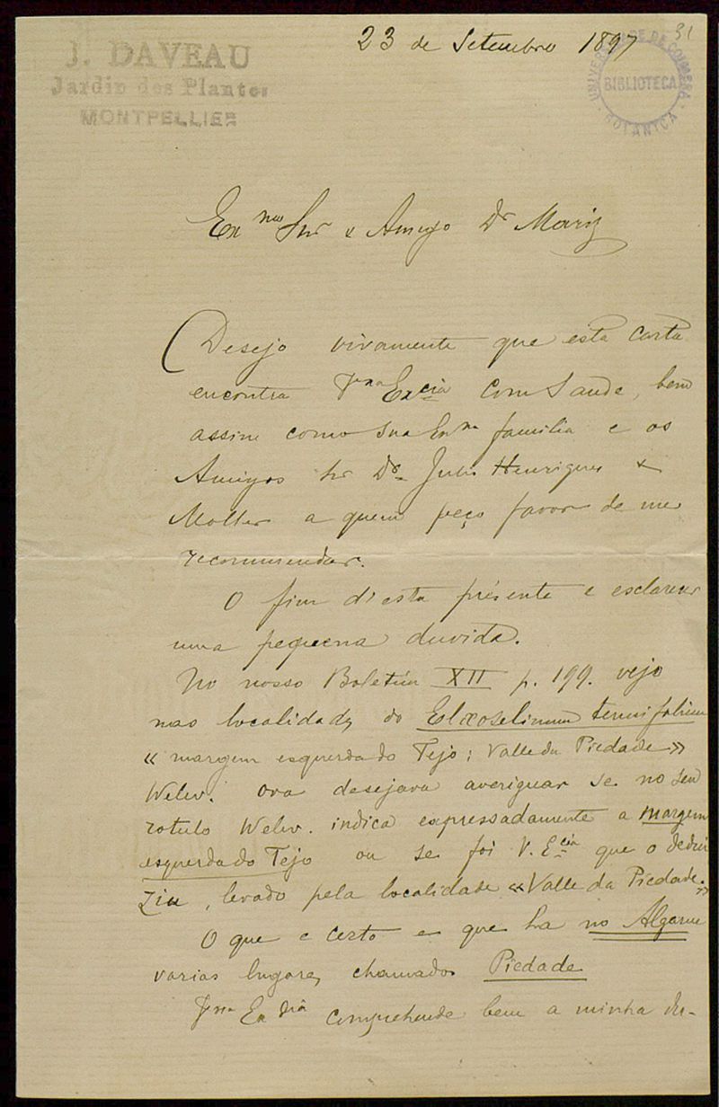 [Carta], 1897 Set, 23, Montpellier, [a] Mariz, [Coimbra]