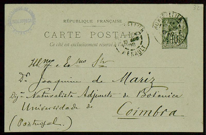 Carte Postale, 1900 Mar. 19, Montpellier, [a] Dr. Joaquim de Mariz, Coimbra