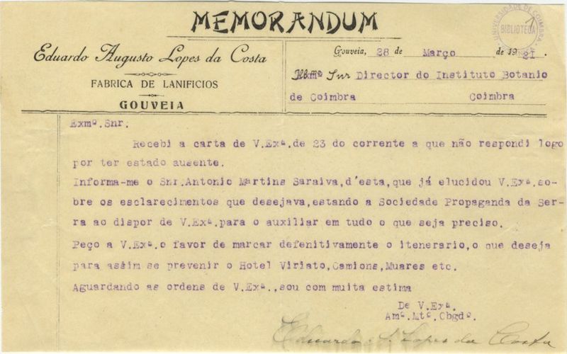 Em papel timbrado de: Eduardo Augusto Lopes da Costa - Fabrica de Lanificios - Gouveia - Memorandum.