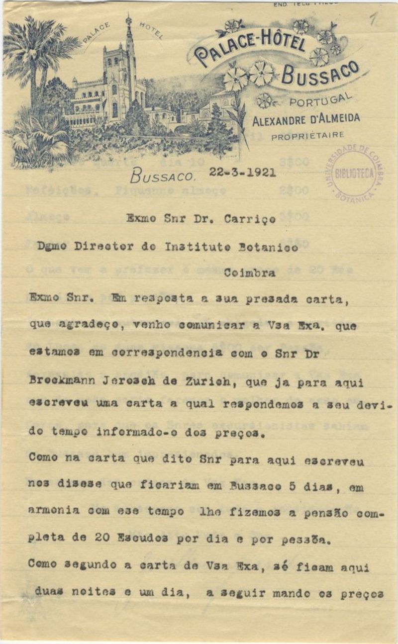Em papel timbrado de: "Palace-Hôtel Bussaco - Portugal - Alexandre d'Almeida - Propriétaire". - Com imagem do Hotel.