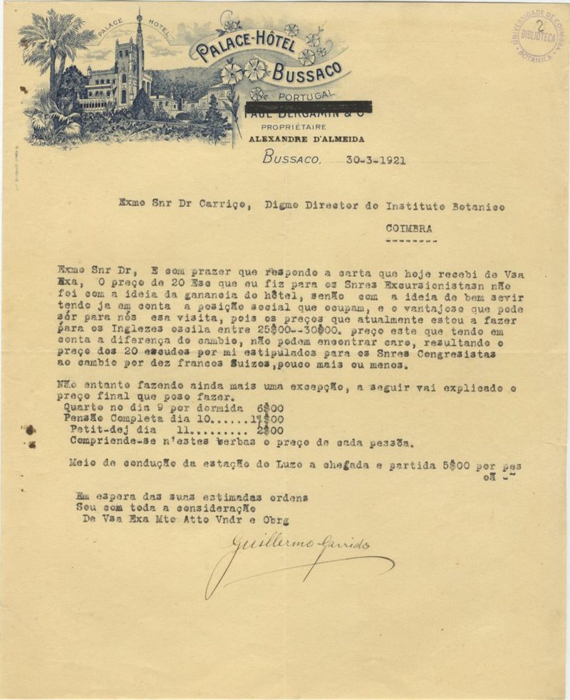 Em papel timbrado de: "Palace-Hôtel Bussaco - Portugal - Alexandre d'Almeida - Propriétaire". - Com imagem do Hotel.