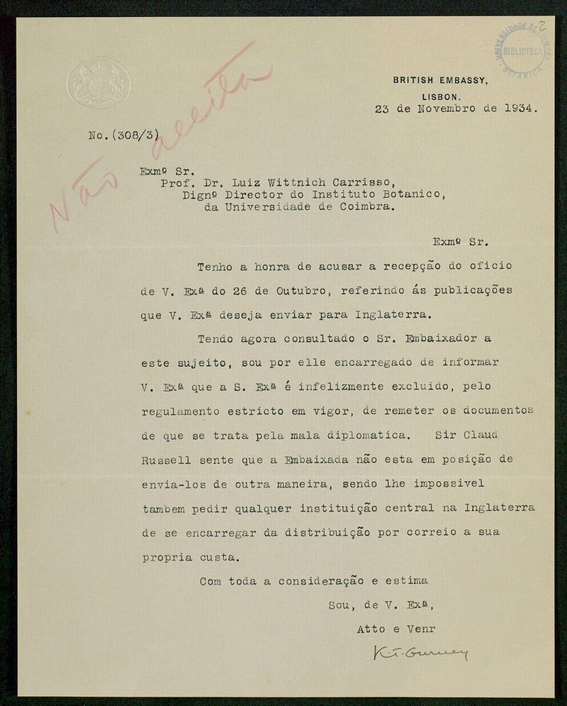 Papel timbrado de: British Embassy Lisbon com selo branco.