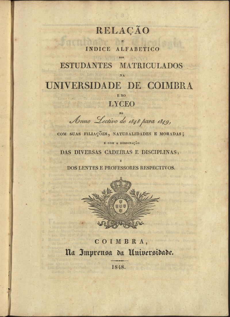 Relação e índice alfabético dos estudantes matriculados na Universidade de Coimbra e no Liceu