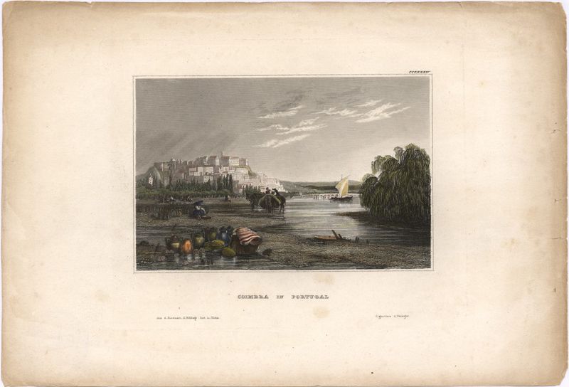 Vista parcial da cidade, vendo-se em primeiro plano lavadeiras no rio.