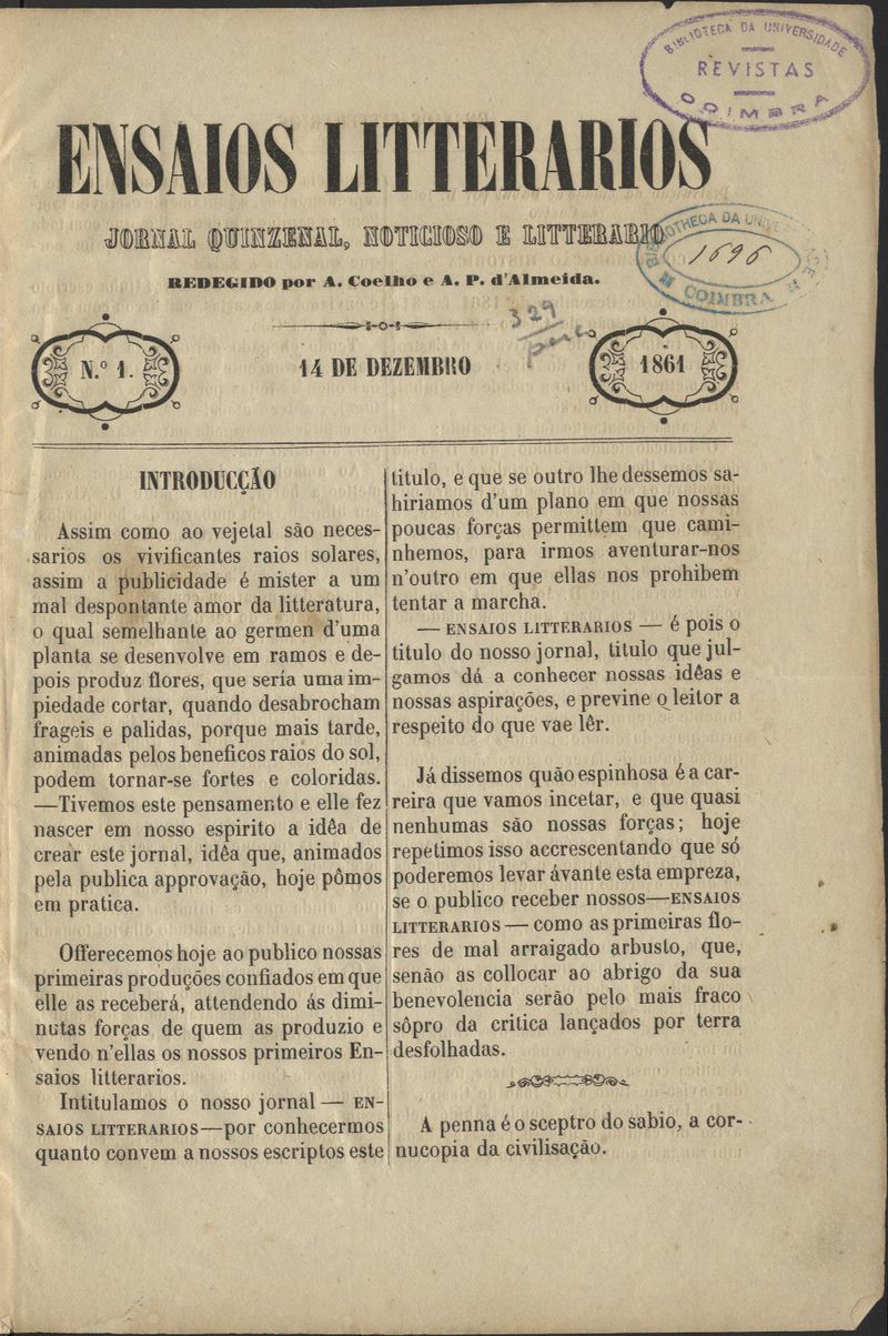 Ensaios litterarios : jornal quinzenal, noticioso e litterario Nº1