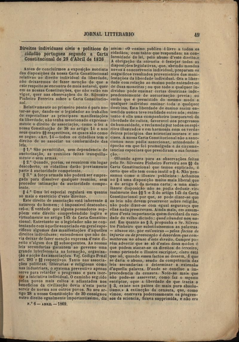 Jornal litterario : periódico quinzenal destinado a artigos de litteratura e sciencias – Nº6