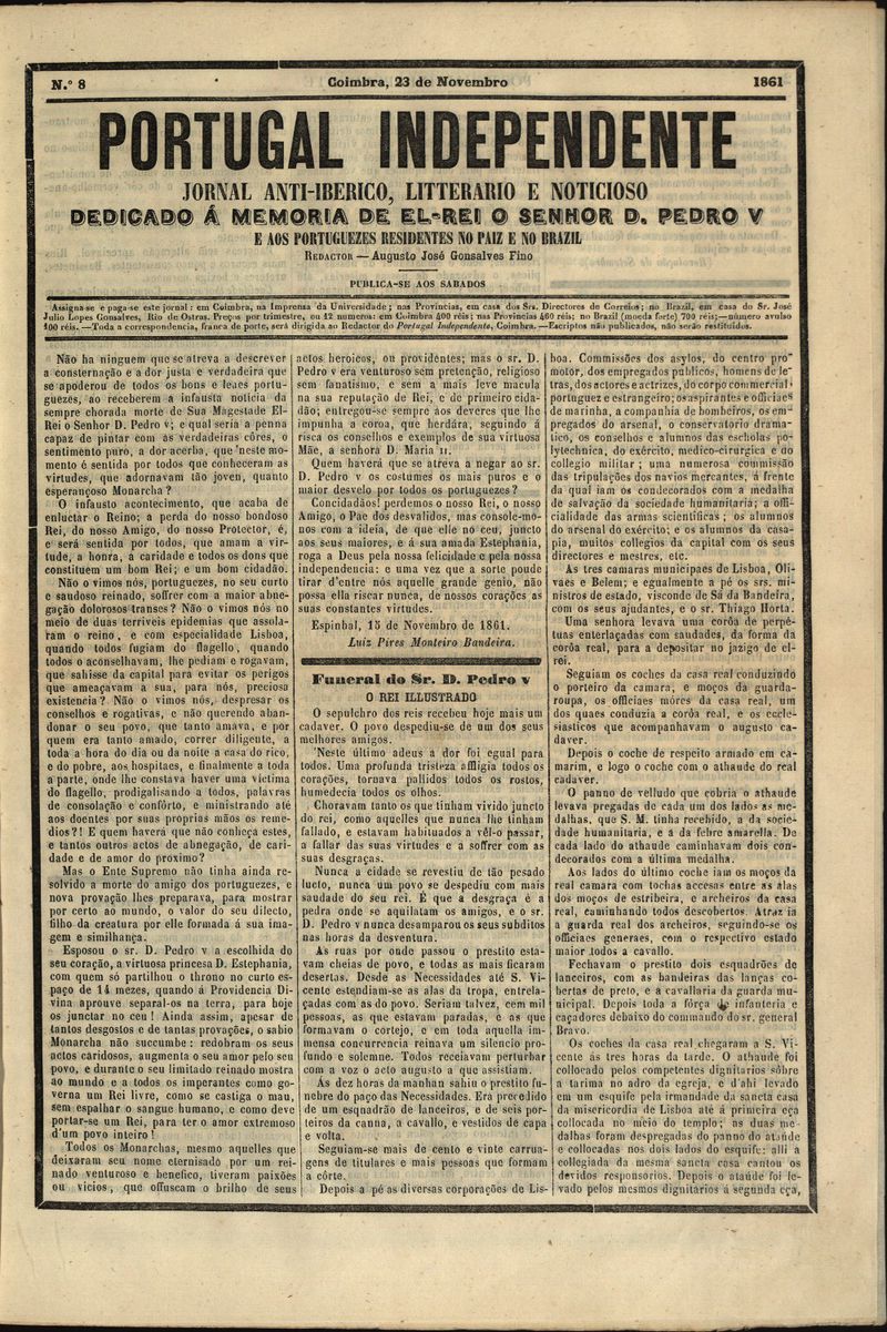 Portugal independente : jornal anti-iberico, litterario e noticioso dedicado a S. M. El-Rei o Sr. D. Pedro V e aos portuguezes residentes no paiz e no Brazil