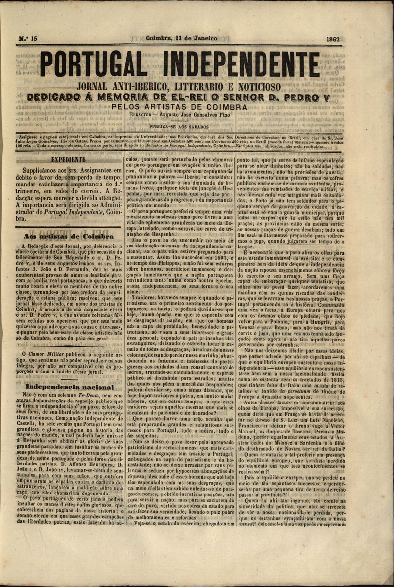 Portugal independente : jornal anti-iberico, litterario e noticioso dedicado a S. M. El-Rei o Sr. D. Pedro V e aos portuguezes residentes no paiz e no Brazil Nº15