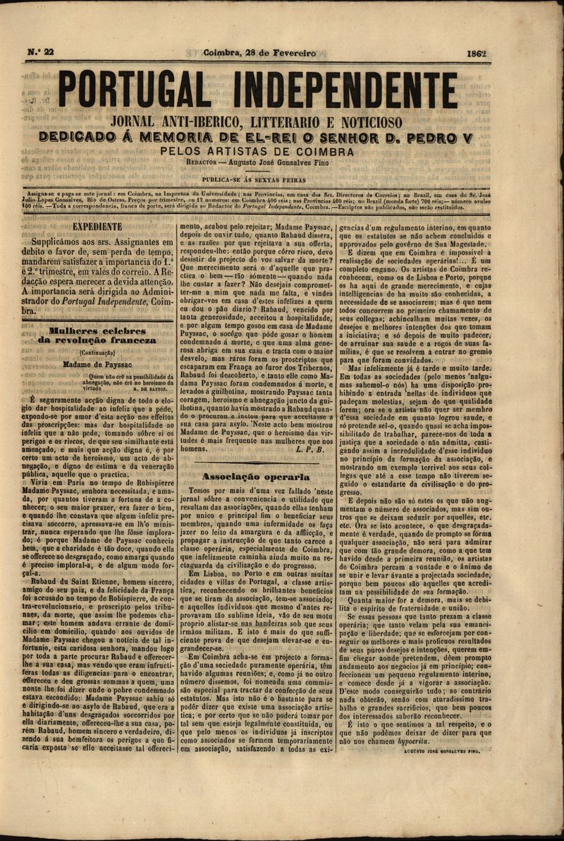Portugal independente : jornal anti-iberico, litterario e noticioso dedicado a S. M. El-Rei o Sr. D. Pedro V e aos portuguezes residentes no paiz e no Brazil Nº22
