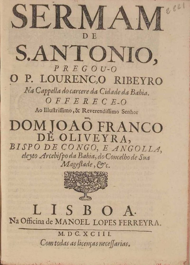 Sermam de S. Antonio, pregou-o o P. Lourenço Ribeyro na Capella do carcere da cidade da Bahia..